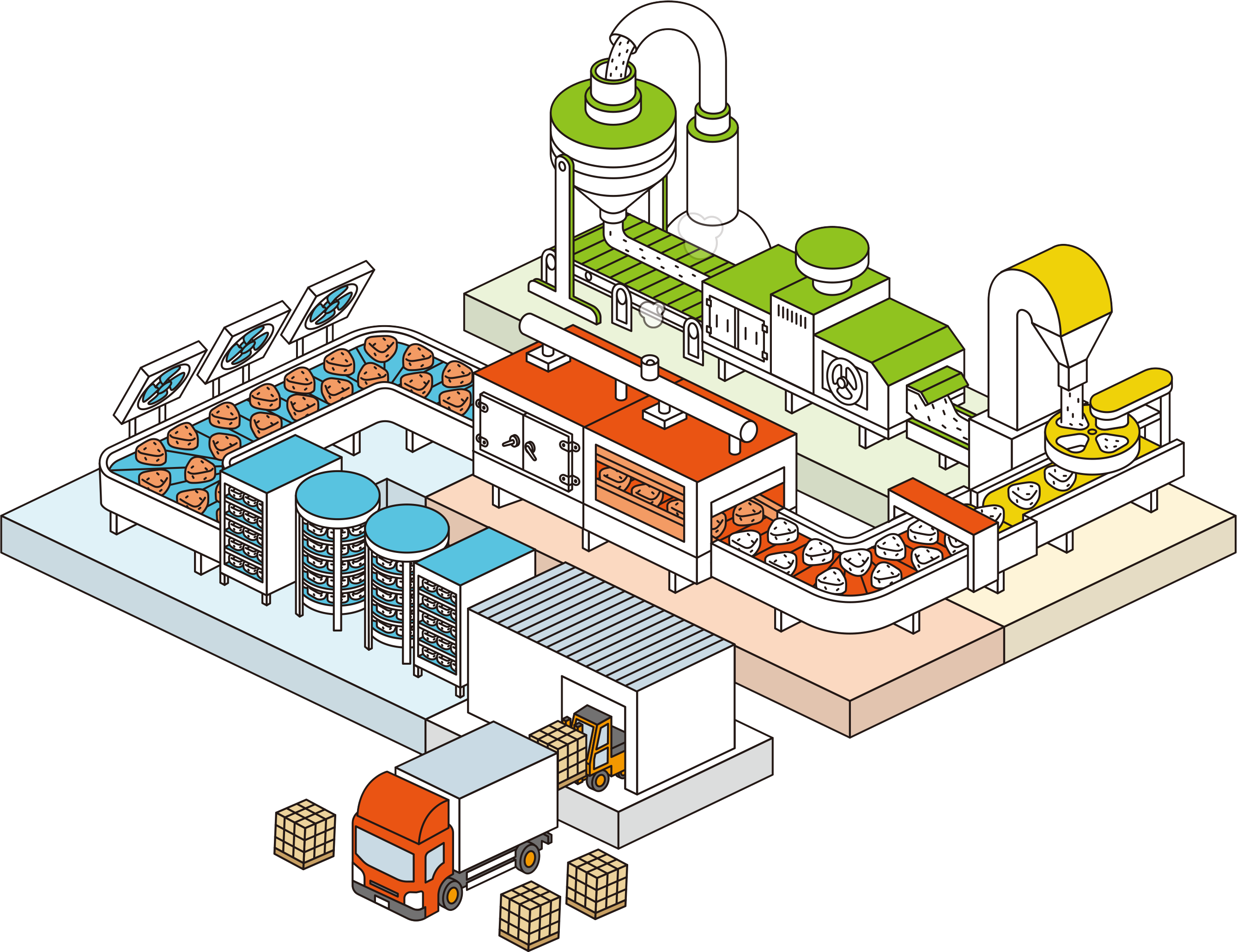 その人気にこたえるために、焼きおにぎりの工場ではたくさんの焼きおにぎりを作っているんだ!